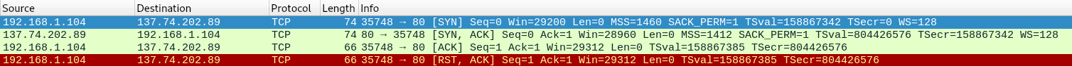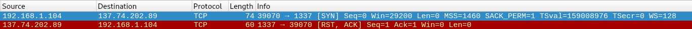 During the scan, we open Wireshark and check for the packets sent using a filter that will show us only the packets sent to our target IP address: “ip.addr == 137.74.202.89”. Below is the result: