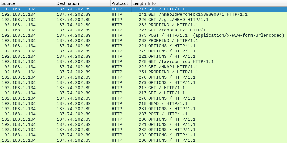 As you can see, nmap scripts will send several HTTP requests useful to find more information about the application running on the web server. For example, it will send a request to find if “.git” directory is present, which can contain source code, it sends a request to get “robots.txt” file which might lead to additional paths and one script even sends a POST request to find if there is a RPC (Remote Procedure Call) aware service running: