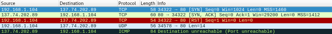 2. Last two packets are UDP and ICMP: first packet is the one sent by nmap to the remote port 80, and it received an ICMP message “Destination unreachable (Port unreachable)” which informs us that the port is not open and nmap can show it as closed. However, please note that those packets might not be sent.